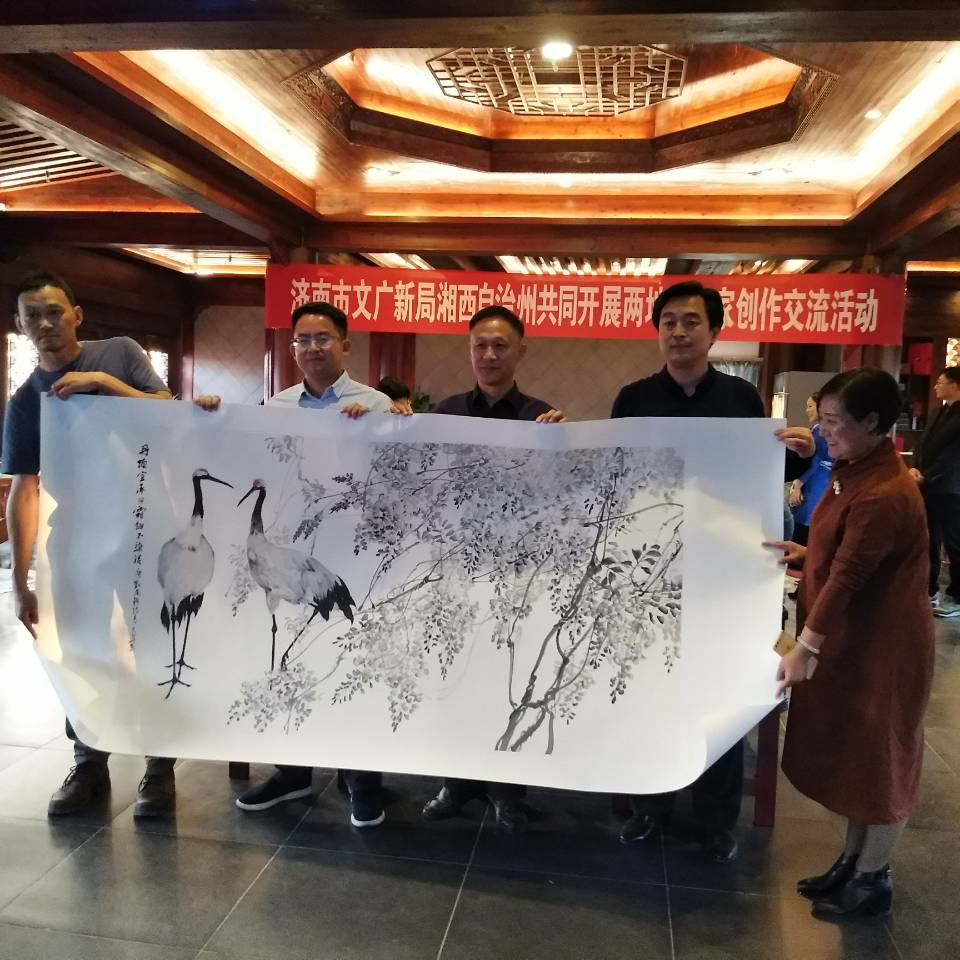 演出交流结束后,济南市文艺团队来到浦市古镇,参观了游客中心、万寿宫、青莲世第、李家书院等地,询问了解这里的文化和传统。最后在白沙涉江楼进行了书画创作交流,并捐赠了20余幅字画。