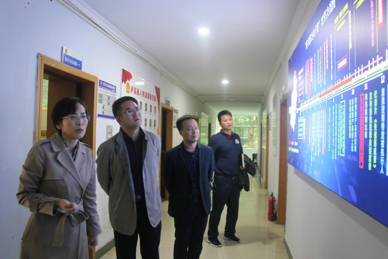 尚远道副县长(左二)在县法院院长张瀚冰(左一)陪同下,了解县法院怎样为民办实事、解难事,如何基本解决“执行难”的问题